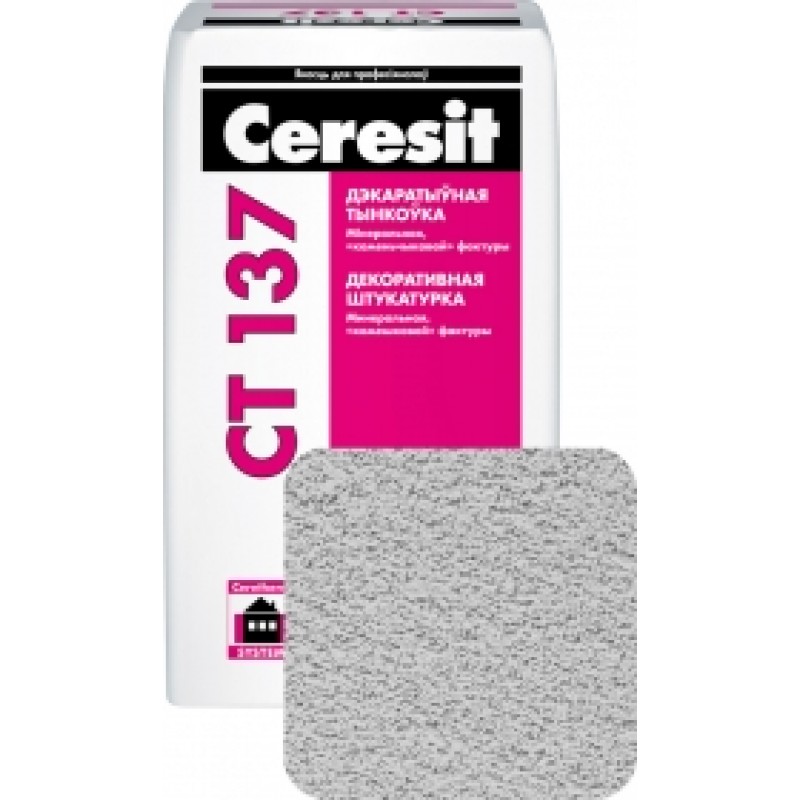 Штукатурка Ceresit CT 137 предназначена для выполнения декоративного тонкослойного покрытия на бетонных основаниях, традиционных штукатурках, гипсовых основаниях, плитах ДСП, гипсокартоне и т.п. Может также служить в качестве декоративно-защитного слоя в легких штукатурных системах утепления наружных стен зданий при использовании в качестве утеплителя как минераловатных, так и пенополистирольных плит. Штукатурка Ceresit CT 137 производится белого цвета, а также в версии под окраску. Окраску штукатурки можно производить акриловой краской Ceresit CT 42 (через 7 суток), силикатной краской Ceresit CT 54 (через 3 суток) и силиконовой краской Ceresit CT 48 (через 7 суток).