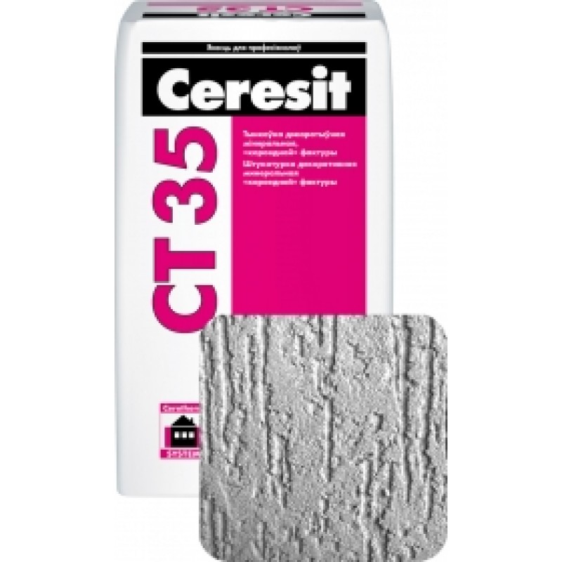 Ceresit CT 35 применяется для выполнения декоративных тонкослойных штукатурок на бетонных и гипсовых основаниях, традиционных штукатурках, ДСП или гипсокартоне. Может также служить в качестве декоративно-защитного слоя в легких штукатурных системах утепления наружных стен зданий при использовании в качестве утеплителя как минераловатных, так и пенополистирольных плит. Штукатурка Ceresit CT 35 производится белого цвета, а также в версии под окраску. Окраску штукатурки можно производить акриловой краской Ceresit CT 42 (через 7 суток), силикатной краской Ceresit CT 54 (через 3 суток) и силиконовой краской Ceresit CT 48 (через 7 суток).