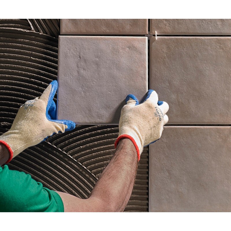 Приготовленная клеящая смесь наносится на облицовываемую поверхность при помощи лопатки, шпателя или терки и равномерно распределяется зубчатой теркой или шпателем. Размер зуба терки выбирается в зависимости от требуемой толщины клеевого слоя. Консистенция смеси подобрана верно, если клей покрывает не менее 65% монтажной поверхности плитки после того, как данная плитка была прижата к основанию. Максимальная толщина растворной смеси под плиткой не должна превышать 10 мм. Плитки предварительно замачивать в воде запрещается! Плитки необходимо уложить и прижать до момента образования корки на поверхности клеевой растворной смеси (пока смесь клеится к рукам). При укладке плитки следует соблюдать ширину шва, соответствующую размеру плитки и условиям эксплуатации. Расшивку швов рекомендуется выполнять фугами Ceresit группы CE. В свежем виде клеящую смесь можно смыть водой, а затвердевший раствор удаляется механически. В помещениях, где плитки будут подвергаться постоянному воздействию влаги, необходимо применять ≪комбинированный≫ метод, дополнительно нанося тонкий слой раствора на тыльную сторону плитки. Существующие в основании температурные и деформационные швы необходимо продублировать в облицовке с последующей их заделкой герметиками Ceresit.